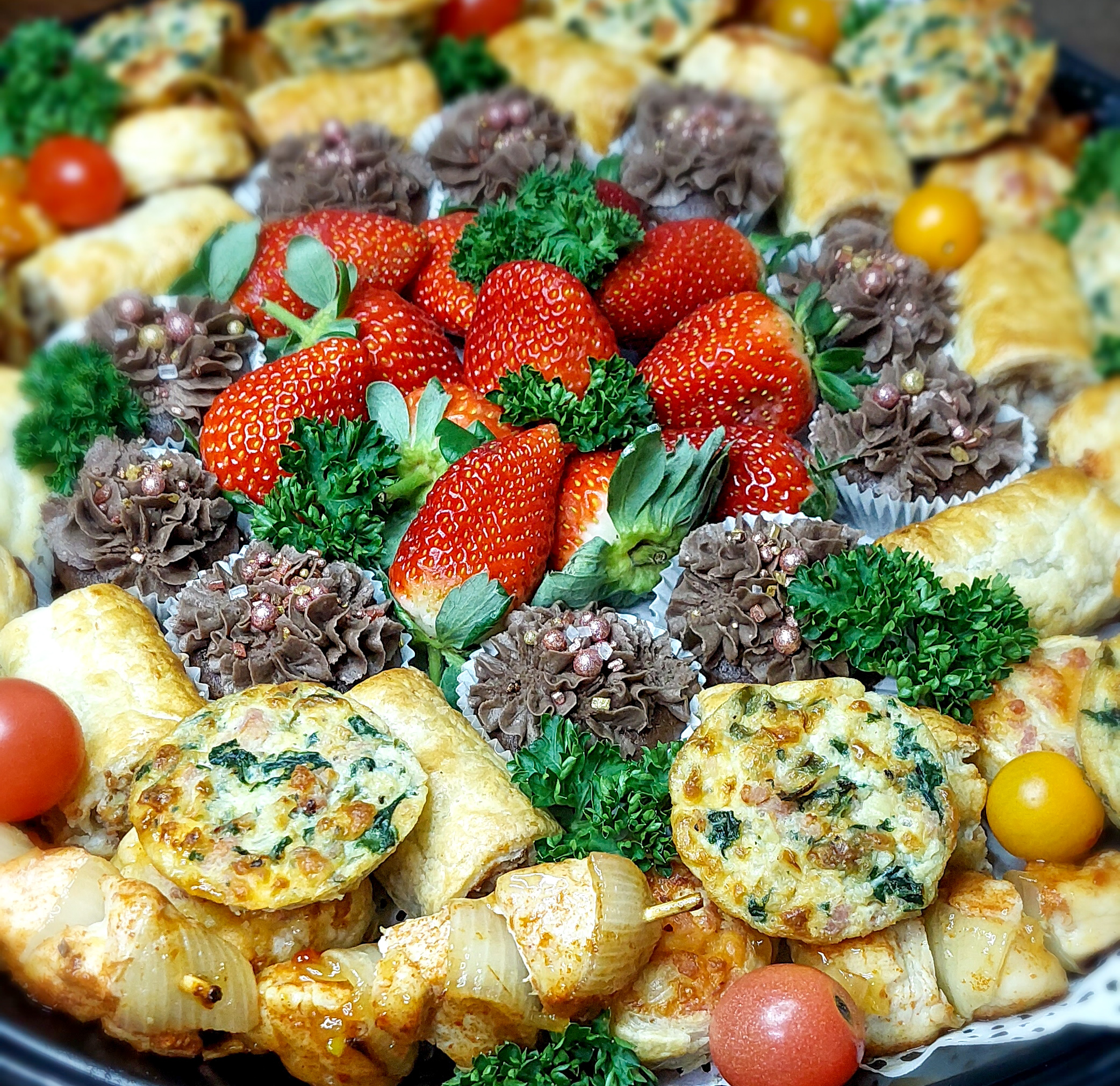 "Sausage Rolls", Kaas Worsies, Klein Vetkoekies met Kaas, Mini Quiche, Ontbeende "Buffalo Wings" & Kouevleis snitte